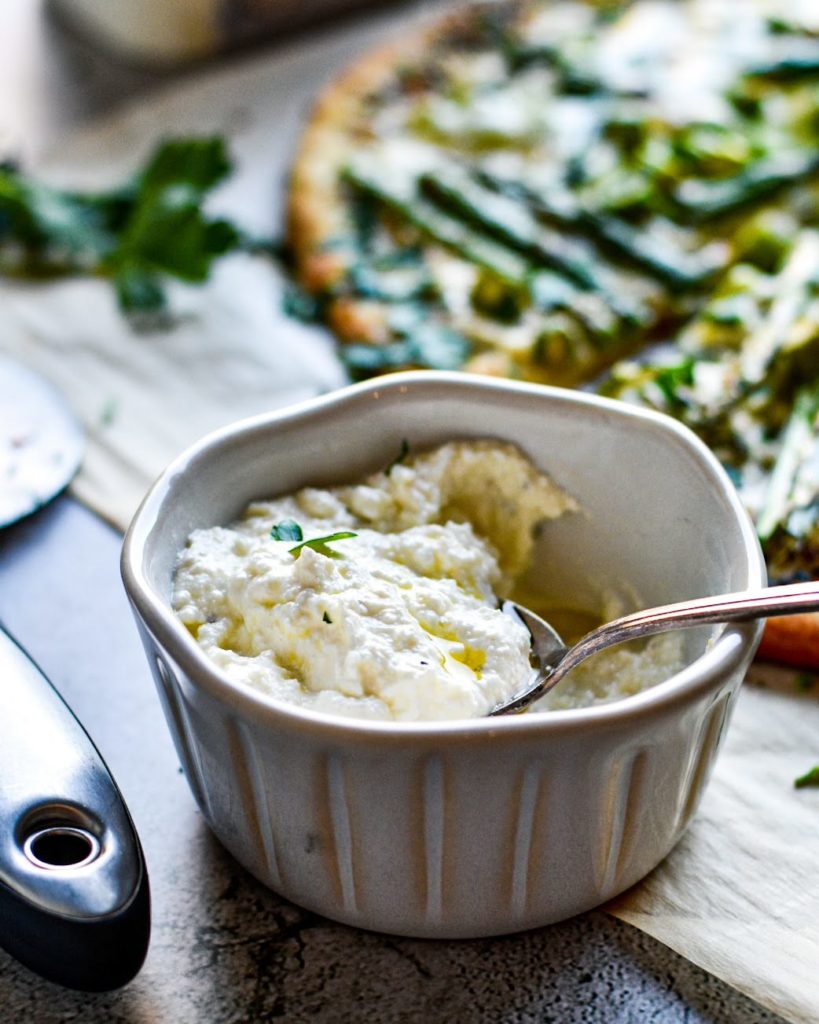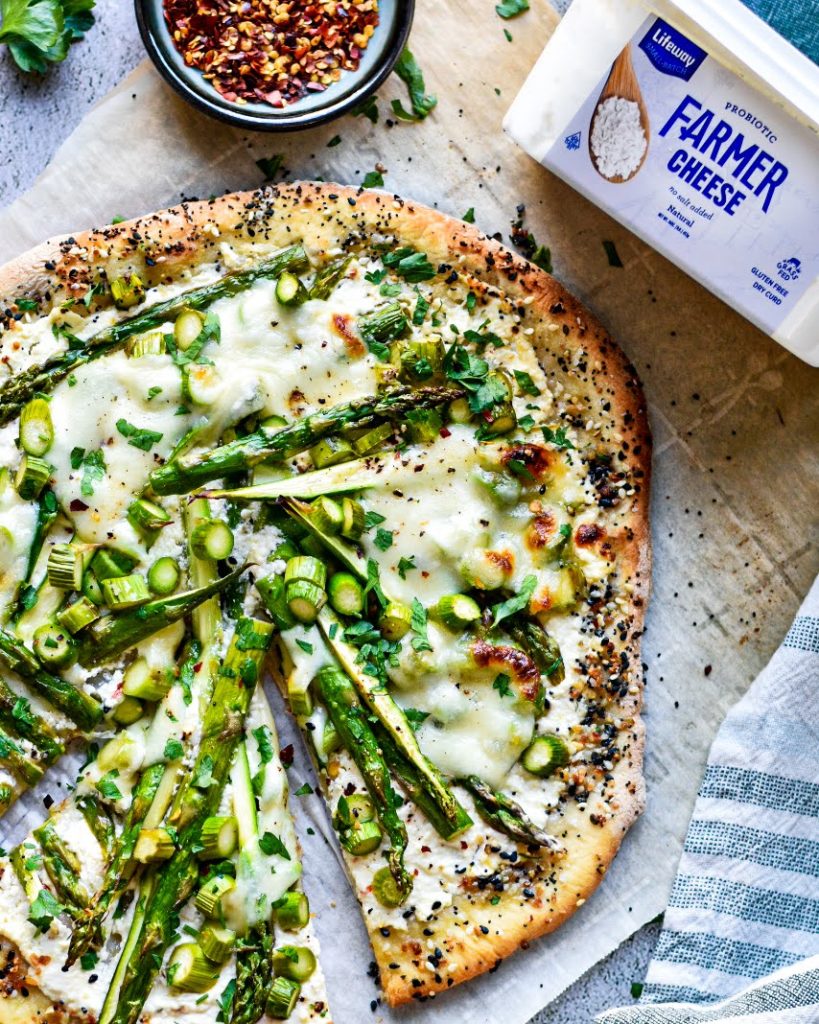 Are you ready for the best and easiest Spring pizza? This Asparagus Pizza requires only a few delicious and nutritious ingredients. It is perfect for weeknight dinners or even Sunday brunch. Why not make this for Mother’s Day or just any family gathering? #ad The sauce for this pizza is a simple mix of farmer’s cheese @lifewaykefir with garlic and herbs.