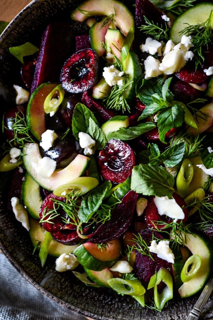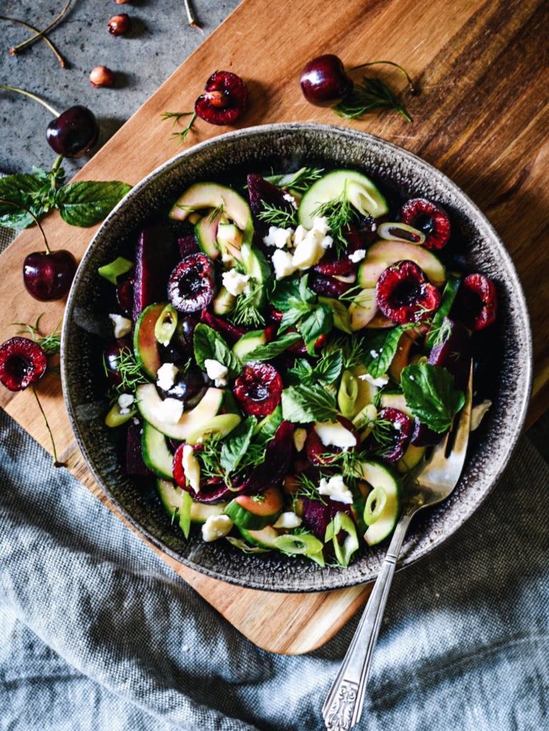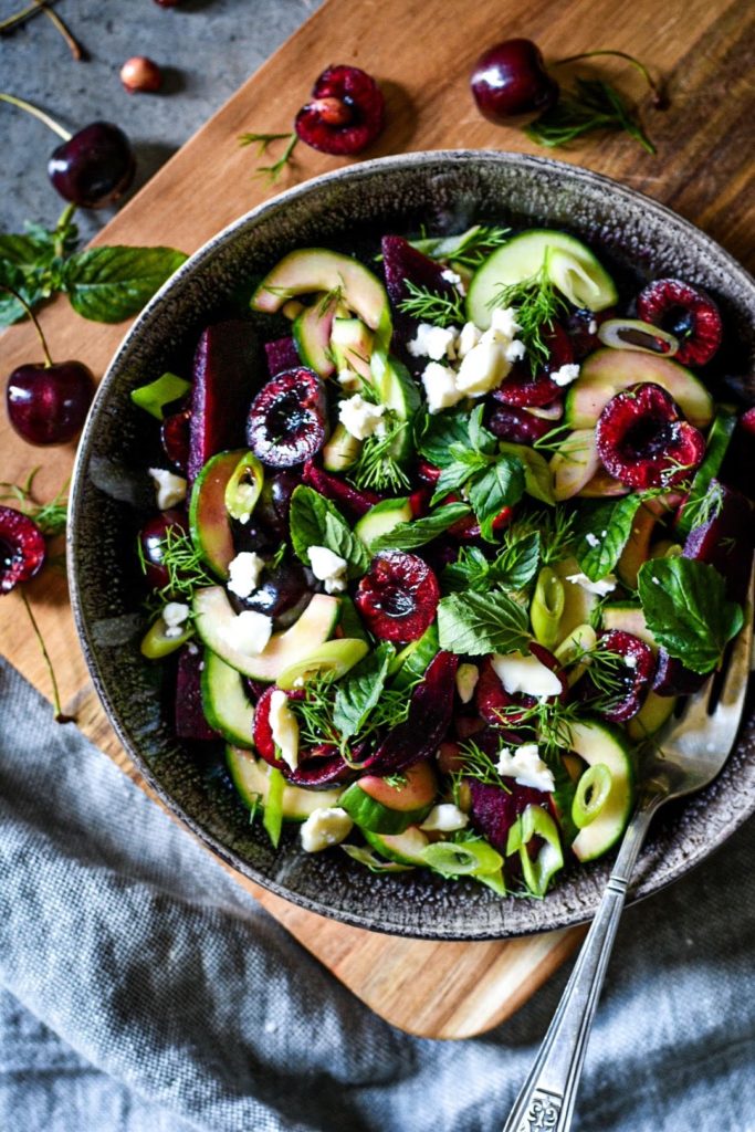 Isn’t this salad cherrylicious? A beautiful combination of roasted red beets, cucumbers, scallions, cherries and fresh herbs makes this stone fruit salad so fresh and delicious that you would want to make it all Summer long. Plus, it is a great way to enjoy seasonal delicious cherries.