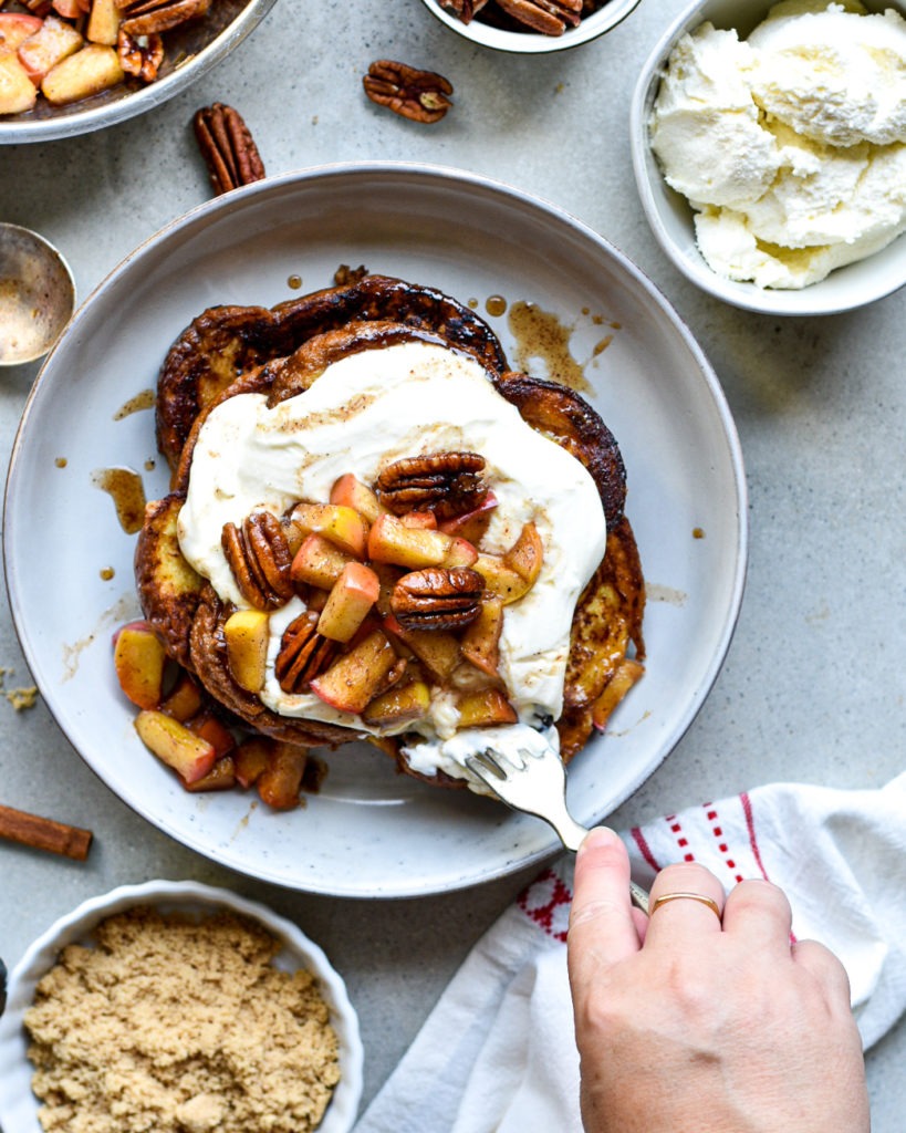 There are some flavors that instantly bring you into that fall state of mind. Warm spices like cinnamon, nutmeg, and clove. Jewel toned apples that begin to appear everywhere. This elegant breakfast embraces those flavors while also elevating your average French toast.