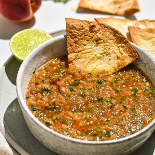 I love making grilled peach salsa on warm evenings when I already have the grill or cast iron skillet going. It’s as stunning in a casual chips-and-dip spread as it is spooned over grilled chicken or fish for dinner!