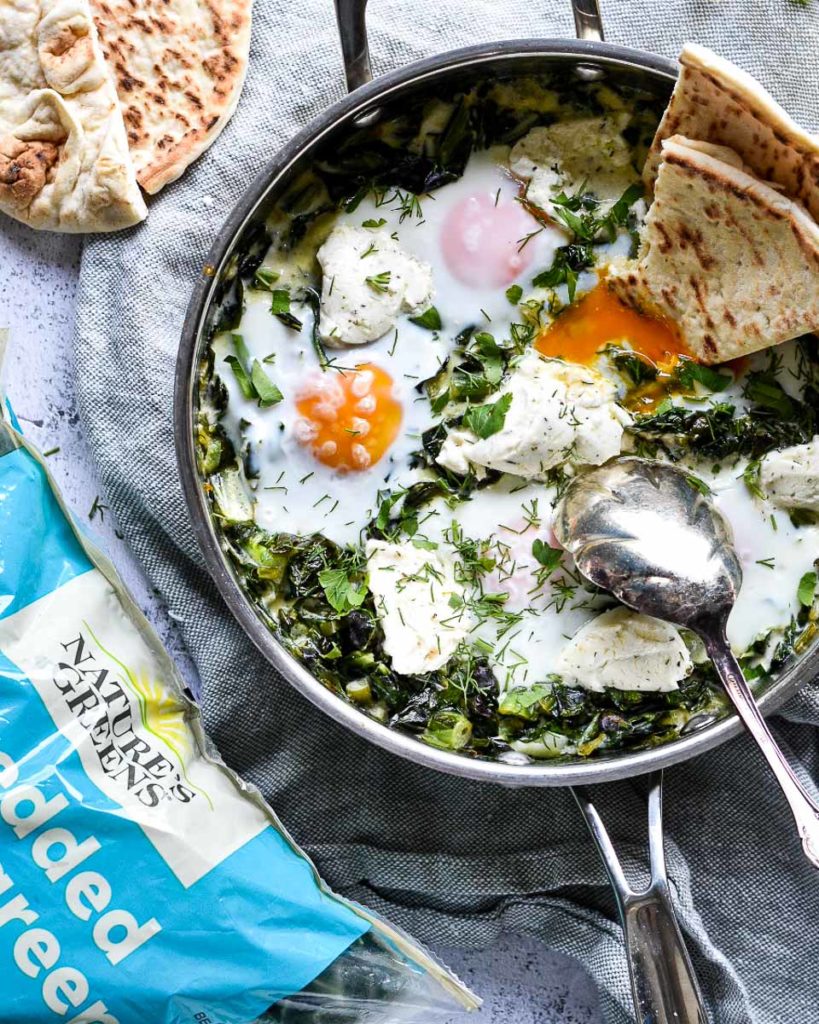 Shakshuka is a traditional North African dish that varies by country and region. Warm and aromatic spices are combined with tomatoes and vegetables for a spicy savory sauce. Because it has gained in popularity you will find many different variations. This version replaces the original spiced tomato base with the bed of greens simmered in just enough heavy cream to make it rich and comforting.