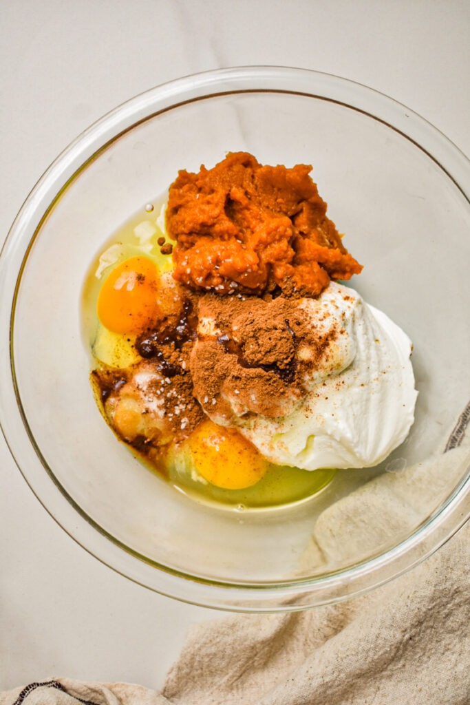 - Prepare the Filling: While the crust is baking, use an electric mixer to combine the cream cheese, Greek yogurt, granulated sugar, eggs, pumpkin puree, vanilla extract, pumpkin spice, salt, and cornstarch. Mix until you have a smooth and creamy filling.