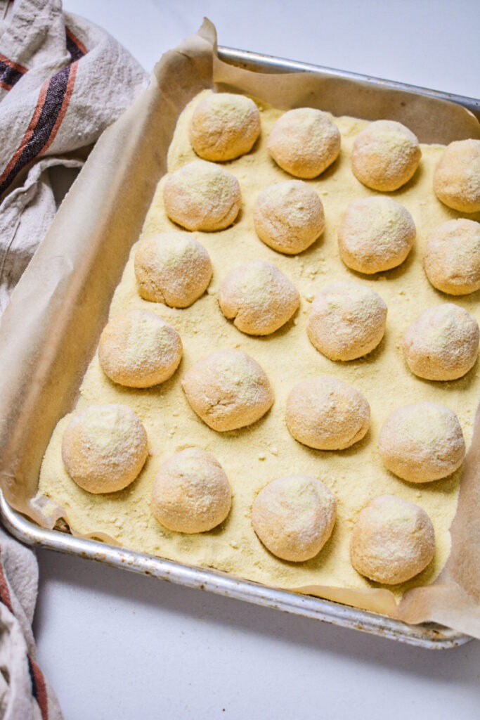 - Use a spoon or ice cream scoop to make little balls about 1/2 “ size. Roll it on your hand and drop it into semolina flour.