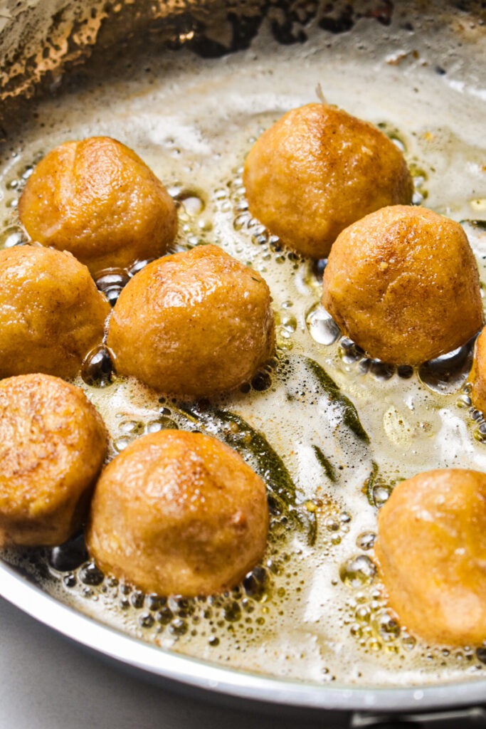 - Drop gnudi in the butter sauce and swirl to coat them.