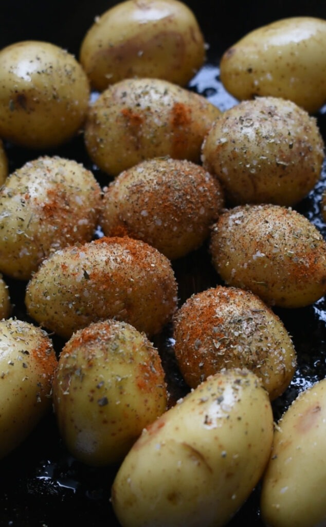 - Wash and dry the potatoes. Transfer potatoes into the cast iron pan. Season and toss to combine. Roast in the oven for 20-25 minutes until the fork goes thru easily.