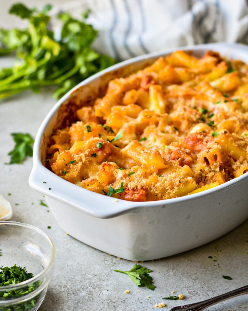 - Fold in the pasta. Spread it into a buttered casserole dish, and top with your parmesan-panko topping.