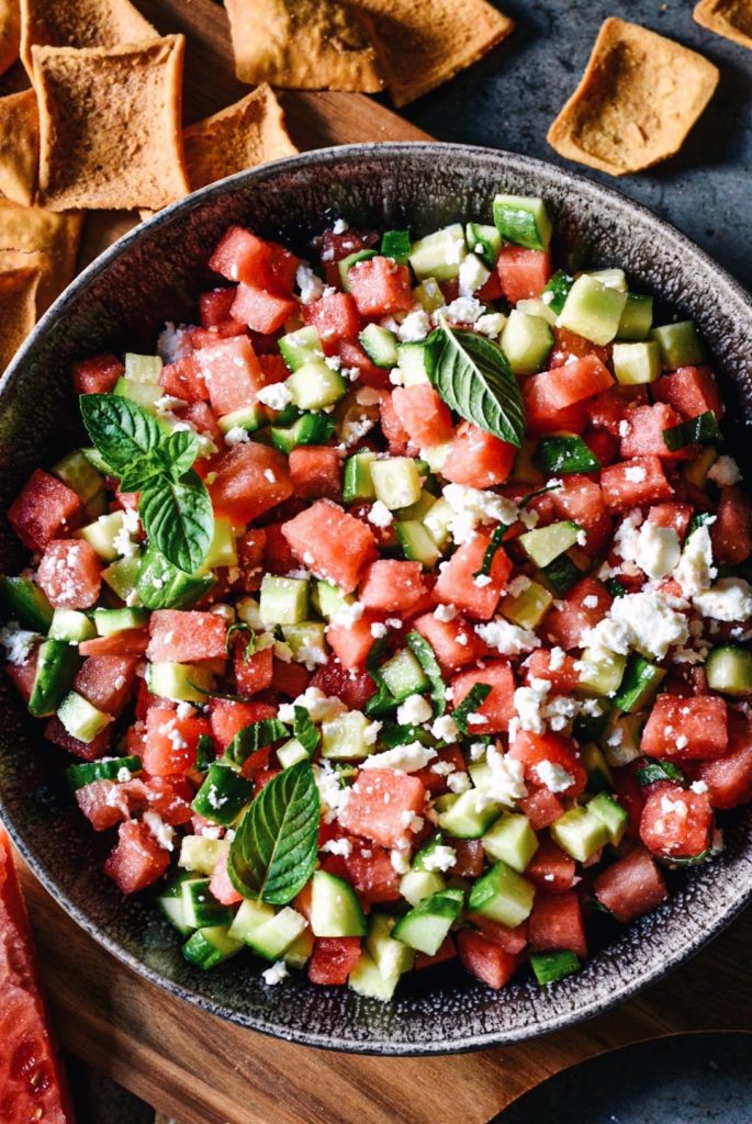 - In a bowl, combine watermelon, cucumber, fresh mint, feta cheese, salt and pepper.