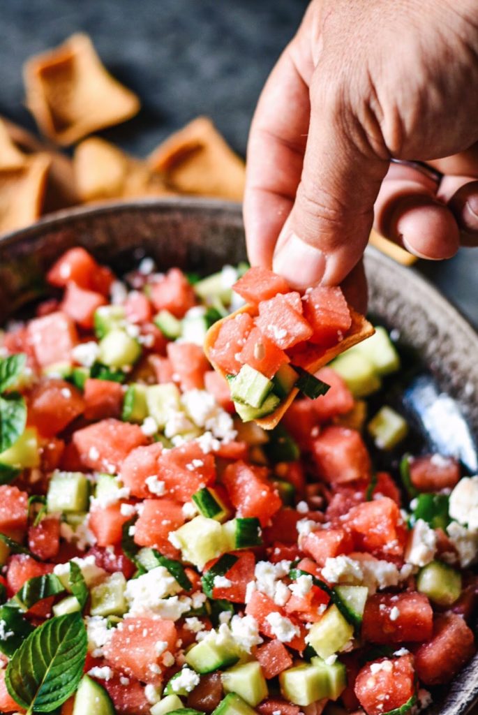 It is great with chips, tacos, or grilled meat. I am thinking that it will be fantastic with a grilled chicken kebab! I took a spin with Mediterranean flavours, by using mint and feta cheese. You will end up with a very refreshing salsa that you want to make and enjoy all summer. Plus, if you are going to use this as a dip or appetizer, the chilli lime pita chips from @toufayan are perfect with this juicy, fresh and beautiful looking salsa!